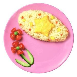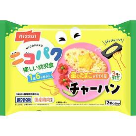 国産鶏肉、たまねぎ、コーン、にんじんを使用。ご飯の上に星の形のたまごをのせたチャーハンです。優しい味付けに仕上げました。