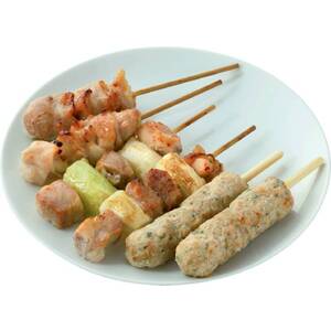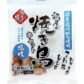 鶏肉(国産)、国産(玉ねぎ・大葉・ねぎ)使用。つくね串、もも串、ねぎま串の3種各2本のアソートです。播州赤穂のにがり塩や白ワインを使用し、深みのある味わいの焼き鳥に仕上げました。レンジで加熱するだけの簡単調理です。