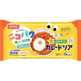 国産鶏肉、5種の野菜(玉ねぎ、にんじん、トマト、かぼちゃ、ほうれん草)、ホワイトソースを使用。ご飯の中に星の形のかまぼこが入ったカレードリアです。塩分を抑え、やさしい味付けに仕上げました。