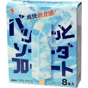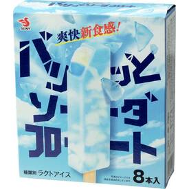 バリっとした食感のソーダキャンディーで、バニラアイスとソーダ風味のソースを包みました。食感と味のコントラストが楽しめます。ラクトアイス規格。