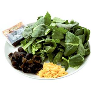 国産小松菜、きくらげ、スクランブルエッグ、中華炒めだれのセットです。セット内容 小松菜:200g きくらげ:50g スクランブルエッグ:40g 中華炒めだれ:1袋 調理時間目安約5分 ※ごま油はご用意ください