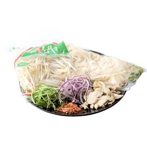 タレ入り茹で米粉麺(フォーの中に小ねぎ・セロリを含む)、もやし、蒸し鶏、紫玉ねぎ、水菜、干し小エビ、アーモンドのセットです。お好みで唐辛子やレモン果汁、パクチーなどを加えても美味しく召しあがれます。セット内容 タレ入り茹で米粉麺:380g 蒸し鶏:60g 野菜:240g(もやし・紫玉ねぎ・水菜) 干し小えび:3g アーモンド:3g 調理時間目安約10分