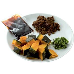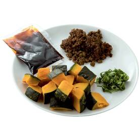 中国産かぼちゃ、鶏そぼろ、小ねぎ、和風調味料をセットしました。セット内容 鶏そぼろ:75g 野菜:210g(かぼちゃ・小ねぎ) 和風調味料:1袋 調理時間目安約10分 ※片栗粉はご用意ください