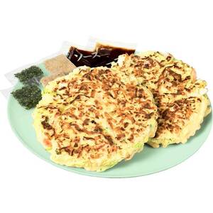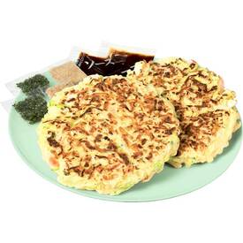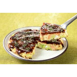 生地にいか、えび、国産キャベツ、国産ねぎをミックスしたお好み焼です。やまいもを加え、外はこんがり、中はふっくらとした食感に焼きあげました。