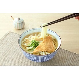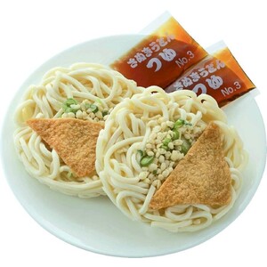 • たぬき(天かす)ときつね(味付油揚げ)、ねぎを、コシのある讃岐うどんに盛り付け、さば、いわし、かつお等の風味がきいたつゆとセットしました。天かすとおあげが両方入ったうどんです。