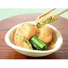 • 北海道産えだまめ・にんじん・こんぶ、国産大豆の豆乳を使用。冷凍のまま、好みのおだしで煮るだけで、枝豆の甘み豊かながんもどきの煮物が味わえます。油抜き不要。煮物やおでんにもどうぞ。