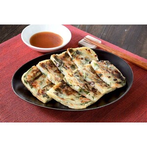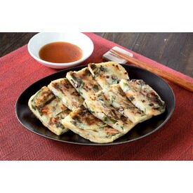 • 国産たまねぎ、にら、にんじん、いか、たこが入った、中はもっちり、外は香ばしく焼きあげたチヂミです。コチュジャン入りのピリ辛たれ付き。
