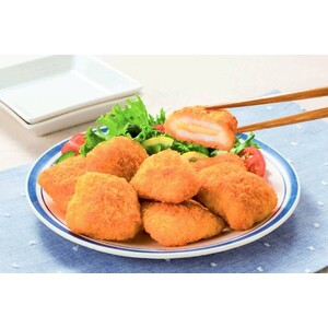 • 若鶏ササミ(国産)を使用。肉の調味に親丸鶏スープを使用し、3種のチーズ(チェダー、ゴーダ、サムソー)をブレンドしたプロセスチーズをはさみました。やわらかなササミ肉にチーズがよくあいます。レンジ調理後もサクッとした食感になるよう衣を仕上げました。お弁当や夕食、おつまみ等にどうぞ。