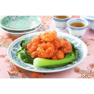 ふっくらとした大きな海老のフリッターに、豆板醤で仕上げたピリッと辛いチリソースをからめました。