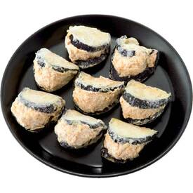 輪切りにした茄子に海老のすり身をつめ、衣をつけて揚げました。
