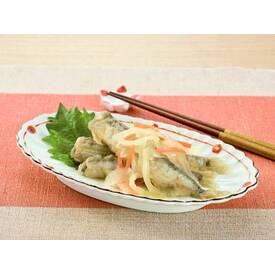 からふとししゃも(アイスランド産)のオスをタイで塩水に漬けて干してから、国内の工場で油調し、野菜(たまねぎ、にんじん)とあわせて南蛮漬けにしました。