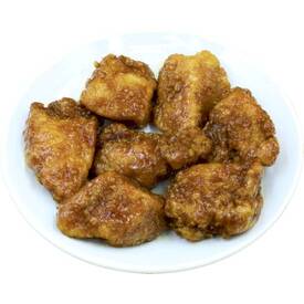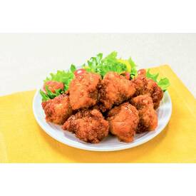 ひと口大にカットした若鶏皮なしムネ肉(国産)の唐揚げに、鹿児島県福山で醸造した黒酢入りの甘酢たれをからめました。肉の下味には沖縄・鹿児島県産のさとうきびからできた砂糖と、チキンスープを使用しています。塩分30%カット。