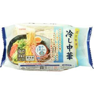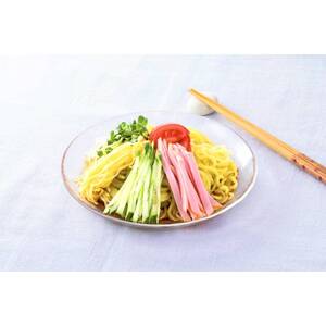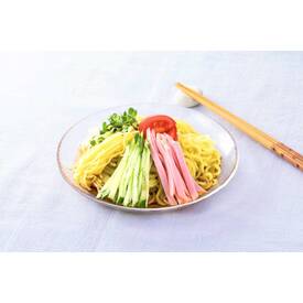 流水で解凍できる冷し中華です。のどごしなめらかな麺に、りんご果汁とはちみつを加えた醤油だれスープをあわせました。かんすい使用。