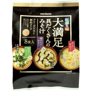 揚げなすとやさい・海苔とおくら各3食、卵と鶏団子2食を詰合せました。米みそと豆みその合わせみそに、かつおと昆布、いわしのだしを加えた具だくさんのみそ汁です。