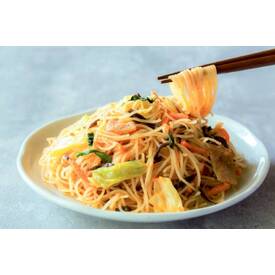 タイ製造ビーフンを使用。豚肉、キャベツ、たまねぎ、にんじん、きくらげ、ニラ入り。鶏ガラやオイスターソースをベースに、3種の胡麻(すりごま、ねりごま、胡麻油)の香ばしさと、韓国唐辛子のほんのりとした辛みが特徴の旨辛な焼ビーフンです。