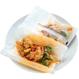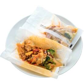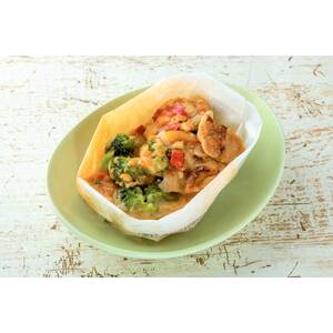 若鶏肩小肉(国産)使用。ひと口サイズにカットして焼きあげた鶏肉、ブロッコリー、赤・黄パプリカ、チーズを、にんにくを加えて味を整えたトマトソースで味付けし、紙包み袋に入れました。