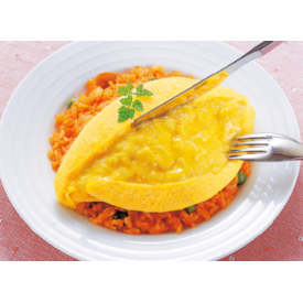 半熟状の卵を包み込んだオムレツです。温めても固まらず、上から切れ目を入れると中身がとろりと流れ出ます。