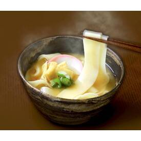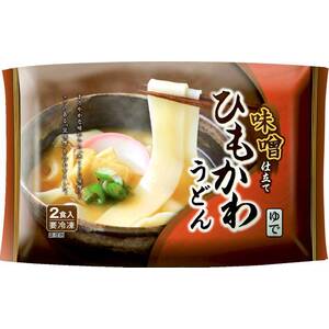 群馬県の郷土料理のひとつ、生地を薄くひらたく伸ばした麺が特徴のひもかわうどんです。幅広のうどんに、ねぎ、きざみあげ、かまぼこをのせ、まろやかな味わいの米こうじ味噌とコクのある豆味噌をあわせたつゆをセットしました。なめらかでつるつるとした食感が楽しめます。
