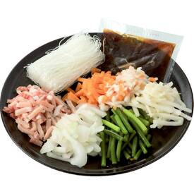 5種の具材(アメリカ産豚肉、筍、中国産玉ねぎ、ニンニクの芽、人参)、春雨、オイスターだれをセットしました。セット内容 肉:豚肉50g 野菜:170g(筍・玉ねぎ・ニンニクの芽・人参) 春雨:30g オイスターだれ:50g 調理時間目安約5分