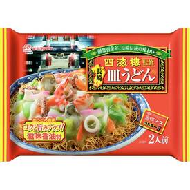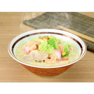 パリパリの細めんに、濃厚な白湯あんかけスープ、金蝶ウスターソースと、味が引き立つ炒め油の滋味香油(じみこうゆ)を添付しました。豚肉、いか、蒲鉾や、お好みの野菜等を加えてどうぞ。長崎伝統の味わい「四海樓」監修。かんすい使用。