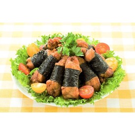 • 若鶏のやわらかいもも肉に醤油で下味をつけ、のりを巻いて揚げました。お弁当等に使いやすいたわら型の唐揚げです。