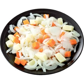 • 北海道産玉ねぎ55%・馬鈴しょ30%・にんじん15%をミックスしました。凍ったまま加熱調理してください。カレーやシチュー、肉じゃが等にどうぞ。
