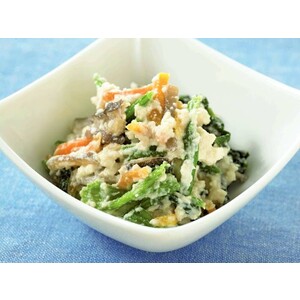 • なめらかにすりのばした豆腐とねりごまに、こんにゃく、人参、椎茸を加えました。茹でたほうれん草やひじき、いんげん等と混ぜれば白あえができあがります。
