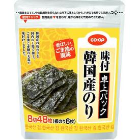 • 韓国産のりにごま油を塗り、赤穂の天塩を振り焼きあげました。風味が良く、ごま油の香ばしさと塩味の調和した味付のりです。便利な卓上スタンディングパック入り。